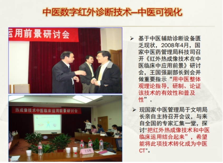 2014年国家中医药管理局将基于红外热成像的中医可视化技术列入重点项目中,2014年6月中医药行业科研专项“基于红外热成像技术的正常人体中医热图研究”项目启动会在国家中医药管理局会议室召开,标志着该项目的正式启动。