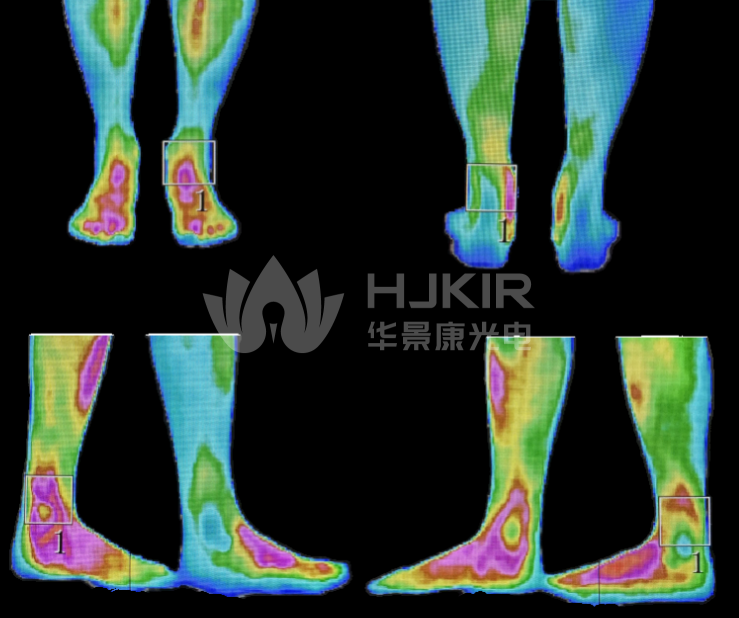 温度变化:急性踝关节损伤区域,因炎症充血和血流增加,温度高于周围正常组织,呈现局部热区,热区形态和位置与踝关节损伤部位相对应。