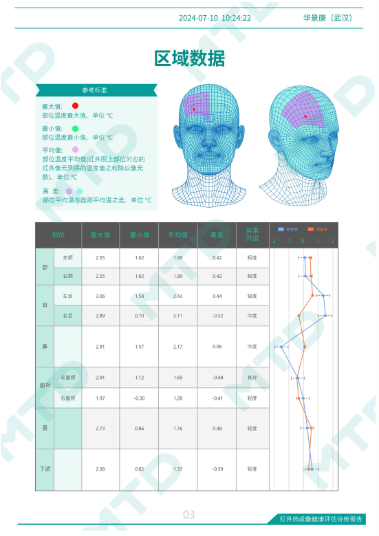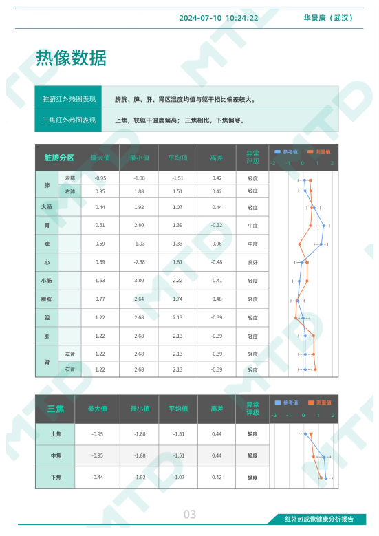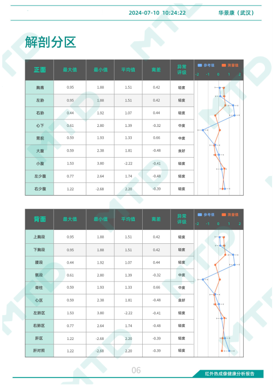 第三页:明确左肺、右肺、大肠等三级分区的温度数据(最大值、最小值、平均值),并通过偏离程度划分异常评级,搭配折线图直观呈现温度变化。