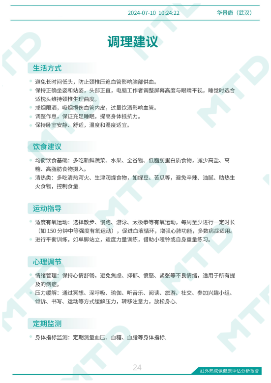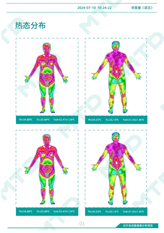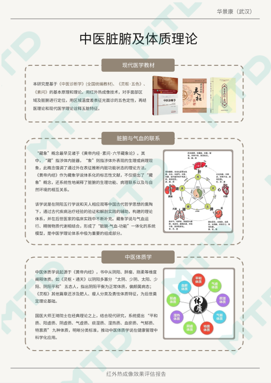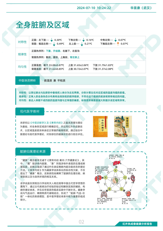 第二页:从对称性、规律性等维度分析全身脏腑及区域,“↑” 代表热偏离、“↓” 代表凉热偏离,规律性分析中标绿部分需重点关注(提示该部位热序列异常),核心针对三级分区的凉热判断。