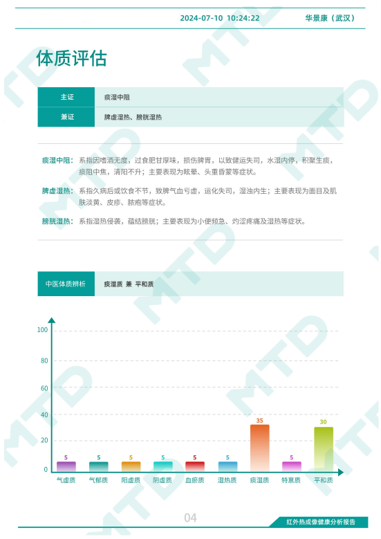 核心数据:每次检测后将生成九种体质评分(总分 100 分),其中平和质得分越高,代表体质越健康,调理疗效越显著。
