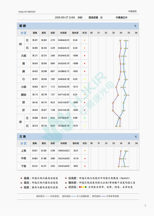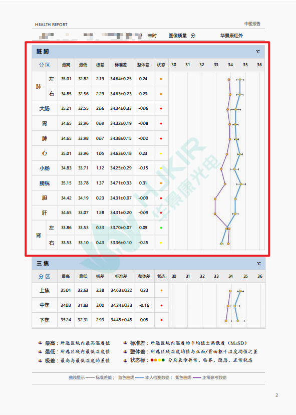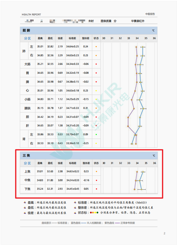 将正面躯干划分为上焦(心肺区)、中焦(脾胃区)、下焦(肾及生殖区) ,同样用折线图展示各焦区的温度数据,帮助判断三焦功能是否协调(如中焦温度偏低可能提示脾胃虚寒)。