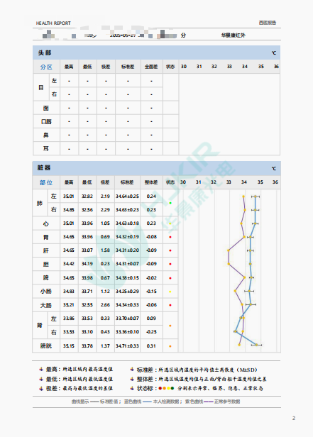 西医通过 “脏器对应体表区域的温度数据”(最高温、最低温、极差、标准差),间接评估脏器的代谢活性、血供情况 —— 温度异常(偏高或偏低)通常提示脏器炎症(代谢活跃,温度升高)、缺血(血供减少,温度降低)或功能异常。报告明确划分多类脏器区域,并标记异常: