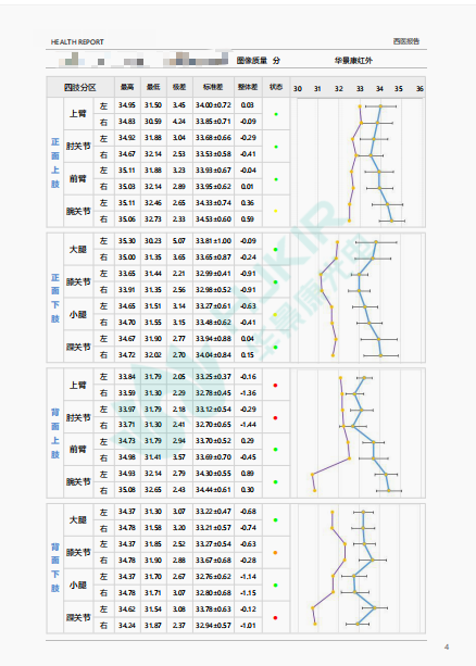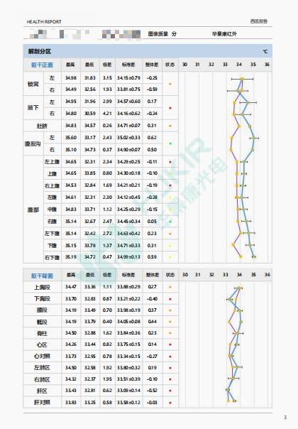 解剖分区按 “躯干正面、躯干背面、四肢” 划分,通过局部温度数据评估肌肉、血管、淋巴结等组织的功能状态,是判断运动系统、循环系统局部异常的重要依据;