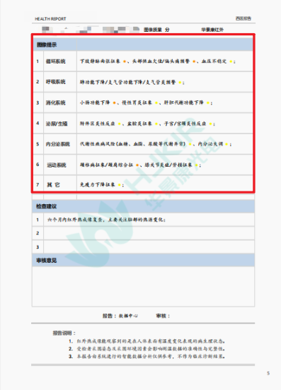 结合脏器、解剖分区的温度数据,报告进一步整合分析全身系统功能,形成 “图像提示”,涵盖循环、呼吸、消化、泌尿生殖、内分泌、运动等多个系统。