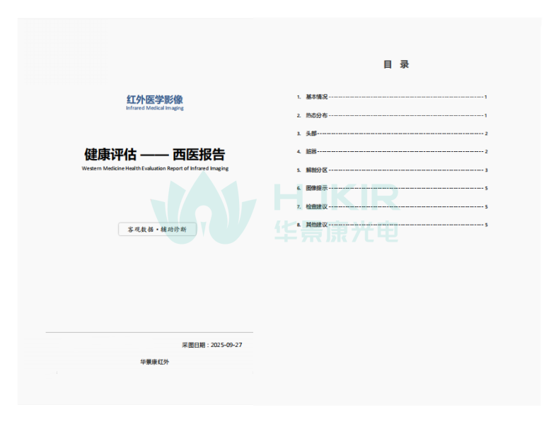 在西医辅助诊疗中,红外热成像报告是评估机体循环、代谢及脏器功能状态的重要工具,可通过体表温度分布差异,为早期发现健康风险、制定干预方案提供数据支撑。基于武汉华景康光电科技有限公司采集的红外热成像数据,我们从 “图像分析” 核心模块入手,拆解热图传递的健康信息,帮助理解身体潜在状态。