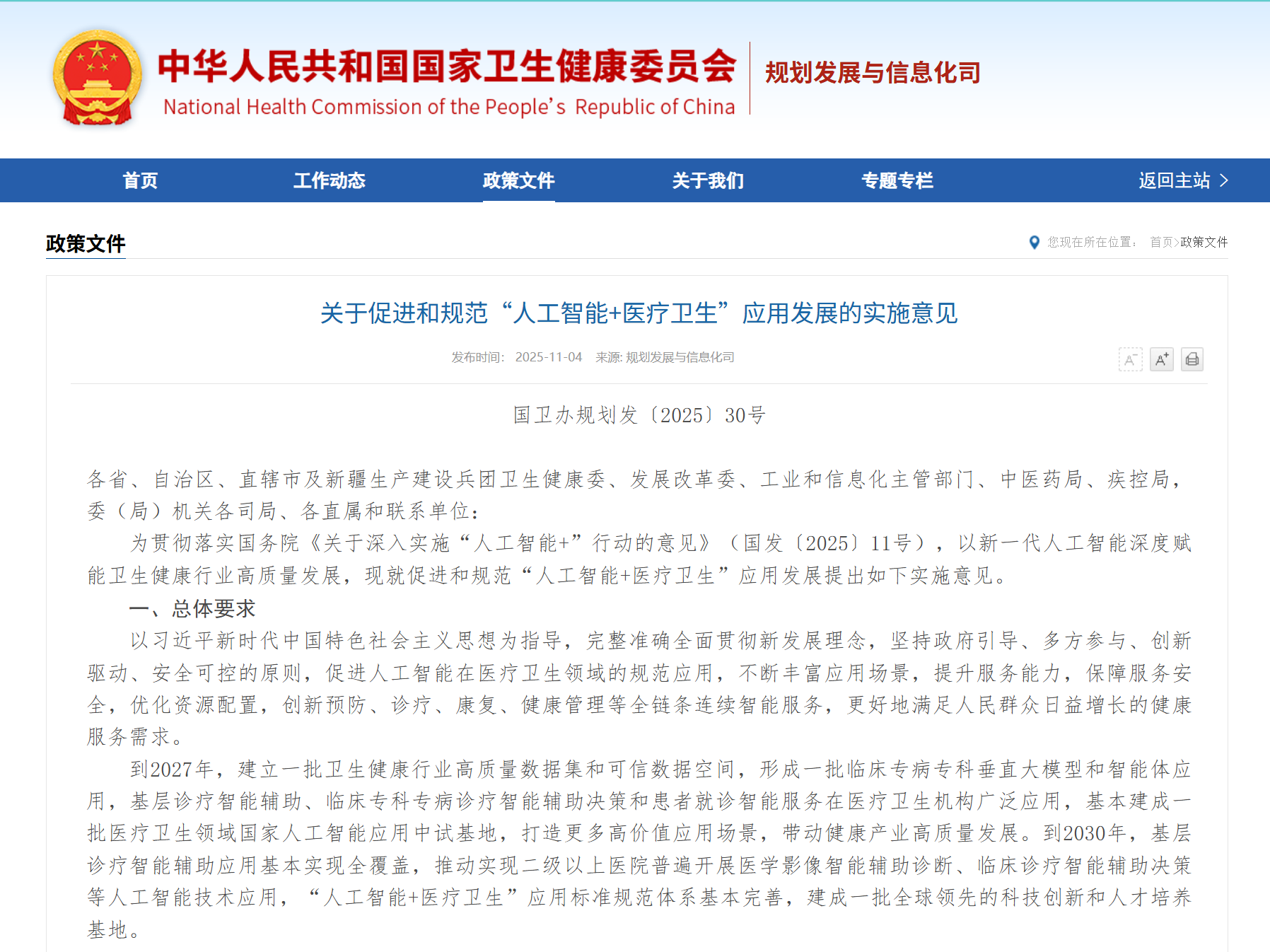 国家卫生健康委、国家发展改革委、工业和信息化部、国家中医药局、国家疾控局五部门,2025年11月20日,联合印发《关于促进和规范“人工智能+医疗卫生”应用发展的实施意见》。
